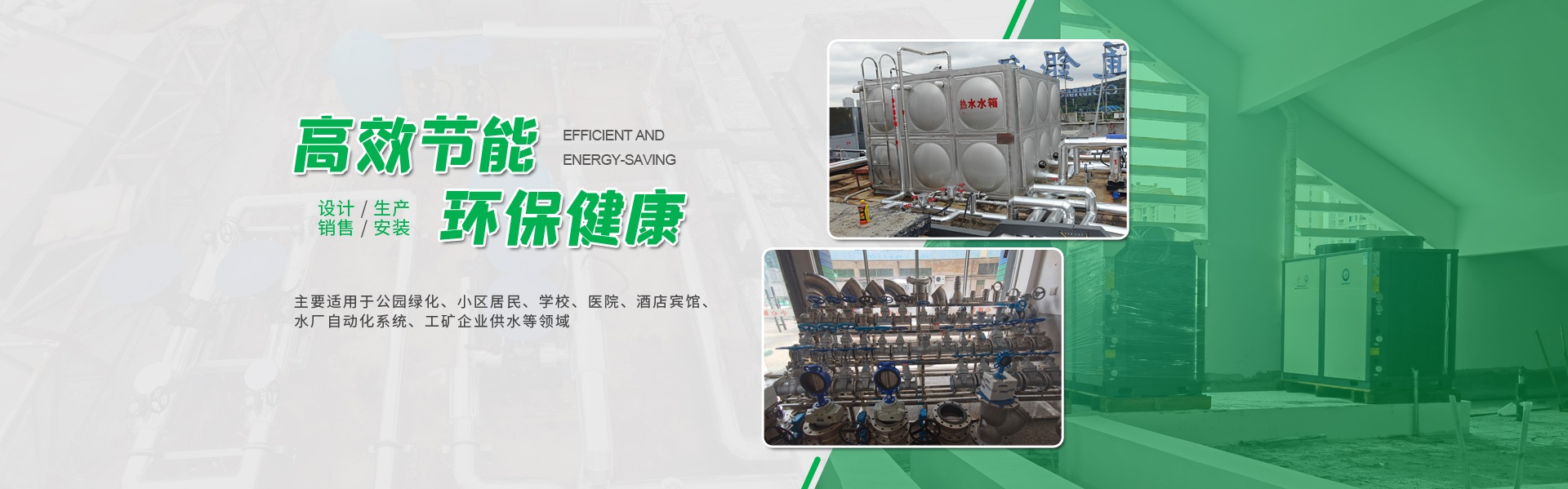 公司主要经营:不锈钢水箱、无焊接装配式不锈钢水箱、箱泵一体化水箱、PES钢塑复合水箱、空气能太阳能热水供水系统;油水分离系统,一体化预制泵站,水箱自洁消毒器、紫外线消毒器、玻璃钢化粪池、PE化粪池、无负压、恒压成套供水设备、海绵城市—无机透水混凝土增强剂及雨水综合利用系统等一系列高效节能产品。